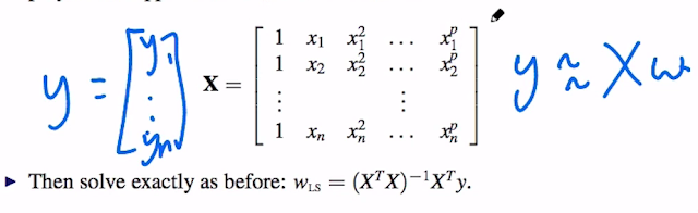 polynomial regression基本上就是linear regression的x function高次方版本,可以寫成通式如下:不論g(x)是什麼,只要f和w的關西是線性的(w次方 <= 1),則我們都可以使用least square estimation來找出w vector,做出一個prediction function y' (or say f):